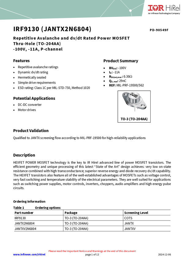 IRF9230 is a high reliability, -200V, single, P-channel MOSFET in a TO-204AA package. It utilizes HEXFET MOSFET technology to achieve low on-state resistance, high transconductance, and superior reverse energy and diode recovery dv/dt capability. Ideal for power supplies, motor controls, choppers, audio amplifiers, and other high-energy pulse circuit applications.