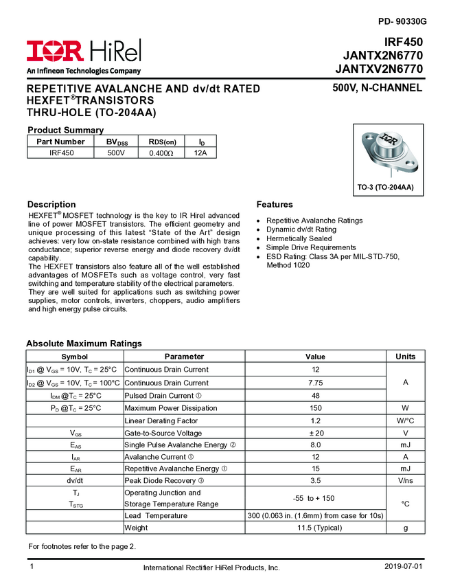 JANTXV2N6770 is a high reliability, 500V, single, N-channel MOSFET in a TO-204AA package. It utilizes HEXFET MOSFET technology to achieve low on-state resistance, high transconductance, and superior reverse energy and diode recovery dv/dt capability. Ideal for power supplies, motor controls, choppers, audio amplifiers, and other high-energy pulse circuit applications. It has TXV level screening and is suitable for defense applications.