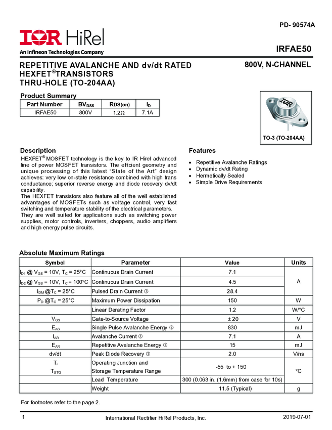 IRFAE50 is a high reliability, 800V, single, N-channel MOSFET in a TO-204AA package. It utilizes HEXFET MOSFET technology to achieve low on-state resistance, high transconductance, and superior reverse energy and diode recovery dv/dt capability. Ideal for power supplies, motor controls, choppers, audio amplifiers, and other high-energy pulse circuit applications.