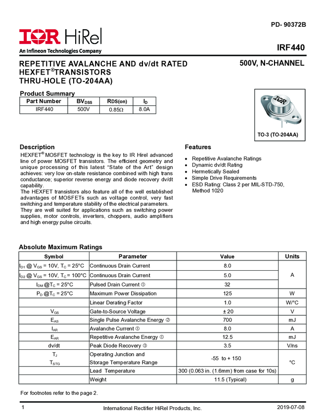IRF440 is a high reliability, 500V, single, N-channel MOSFET in a TO-204AA package. It utilizes HEXFET MOSFET technology to achieve low on-state resistance, high transconductance, and superior reverse energy and diode recovery dv/dt capability. Ideal for power supplies, motor controls, choppers, audio amplifiers, and other high-energy pulse circuit applications.