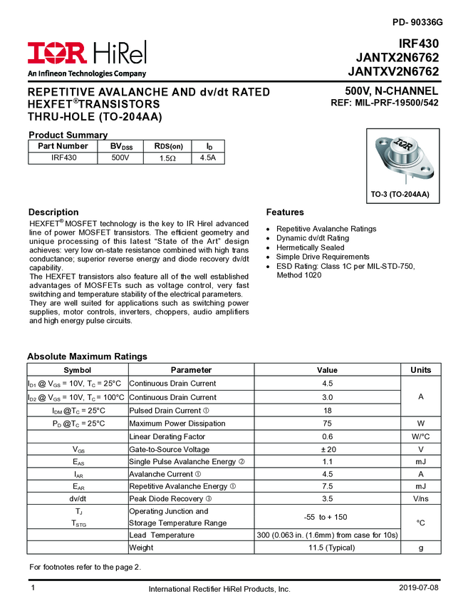JANTXV2N6762 is a high reliability, 500V, single, N-channel MOSFET in a TO-204AA package. It utilizes HEXFET MOSFET technology to achieve low on-state resistance, high transconductance, and superior reverse energy and diode recovery dv/dt capability. Ideal for power supplies, motor controls, choppers, audio amplifiers, and other high-energy pulse circuit applications. It has TXV level screening and is suitable for defense applications.