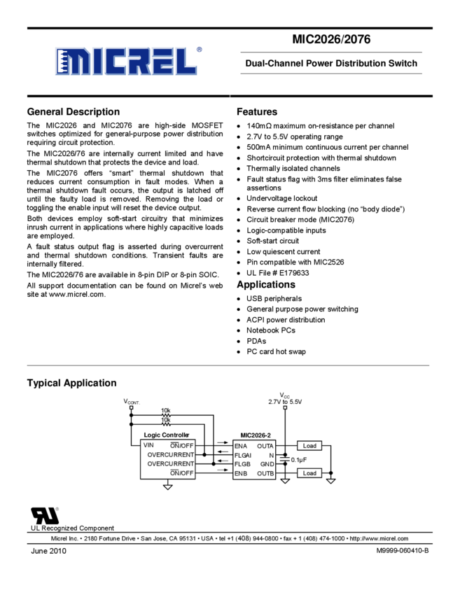 MIC2026/2076 - Dual-Channel Power Distribution Switch (11/05/2015)