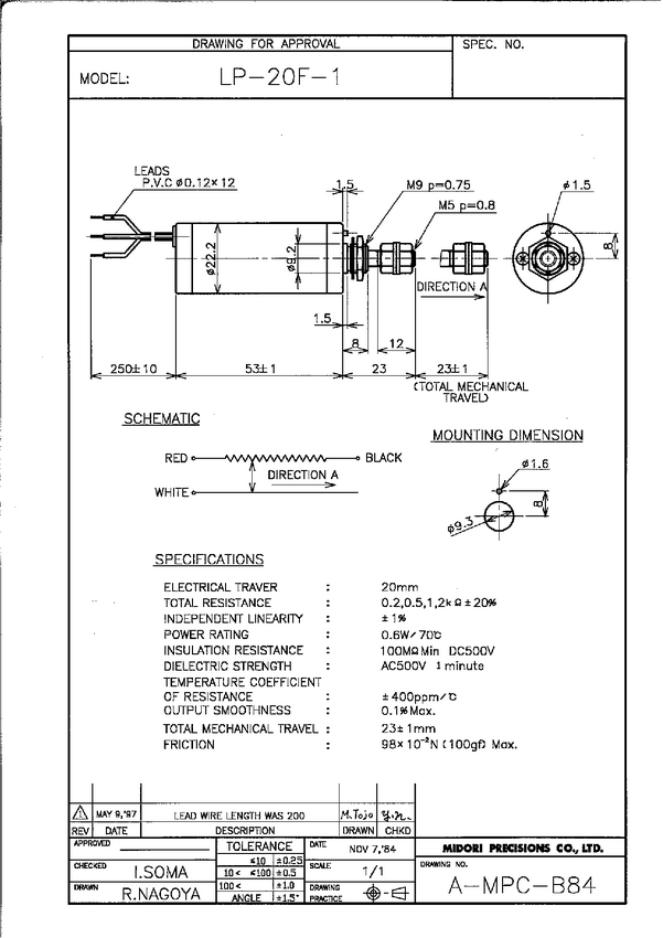 Potencjometr węglowy liniowy 24mm; do wózków elektrycznych; Bushing M9x0,75; P=0,15W; średnica 23,5mm; gł.11,5mm; ośka 6,35mm; dł. 50,8mm; trwałość 2M cykli; kąt el. 45 st ( w tym dead band 8 st) kąt mech 300 st; wypr bok, 64; lin 3%;