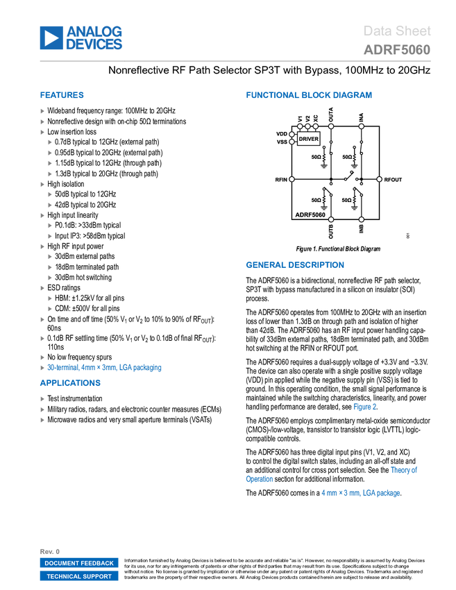 Nonreflective RF Path Selector SP3T with Bypass, 100MHz to 20GHz