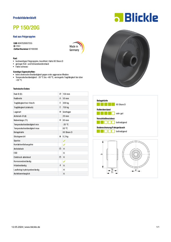 Blickle 7351 PP 150/20G Koło Średnica koła: 150 mm Maksymalne obciążenie: 300 kg 1 szt.