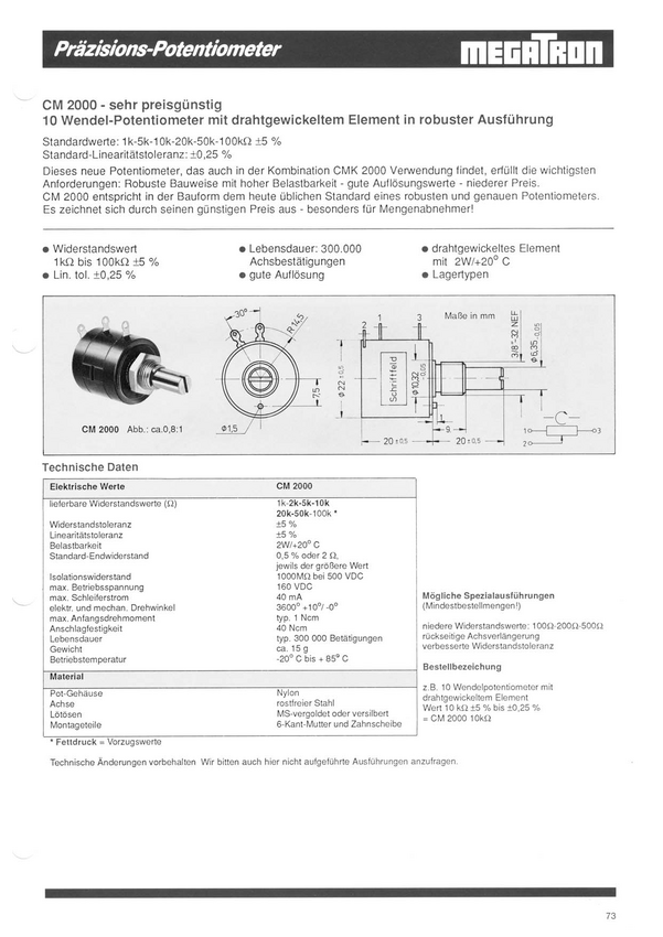 Potencjometr drutowy; bushing; lin 5%; tol 5% 10 obrotowy; średnica 22mm; ośka 1/4"=6,35mm trwałość 300.000 obr; moc 2W/20stopni