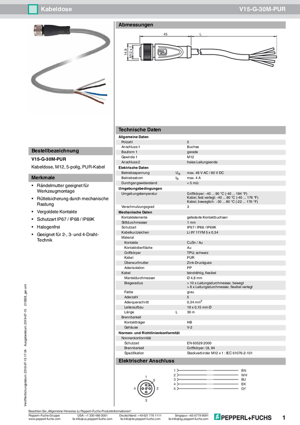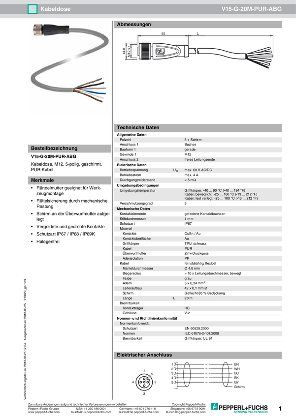 Pepperl+Fuchs 210027 Gniazdo kablowe V15-G-20M-PUR, piny: 5, 20.00 m, 1 szt.
