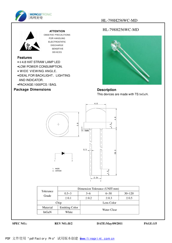 Dioda LED, 5mm, (x:0.31; y:0.33), ca 6500K, superjasna 2100 mCd, water clear, 120 stopni,Honglitronic