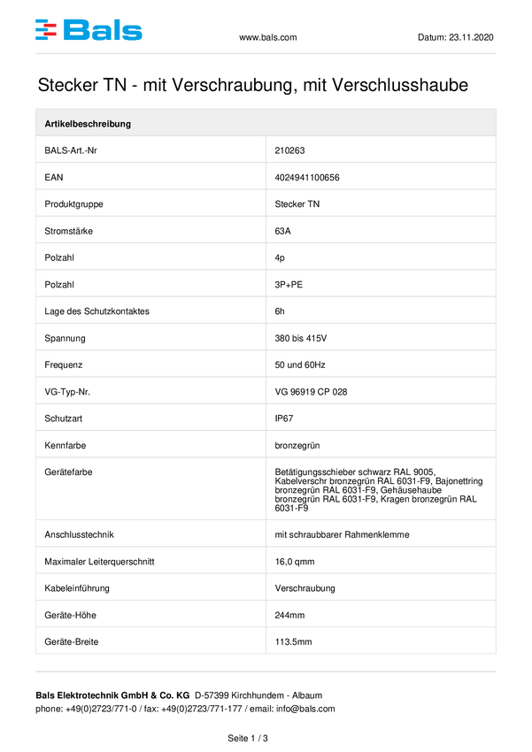 Złacze męskie CEE Bals Elektrotechnik 210263 63.0 A 400 V