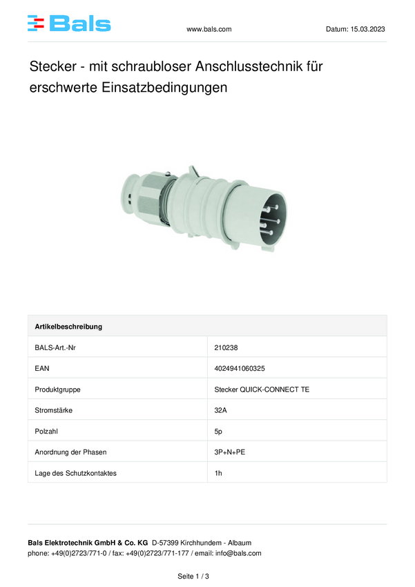 Złacze męskie CEE Bals Elektrotechnik 210238 32.0 A 50 V