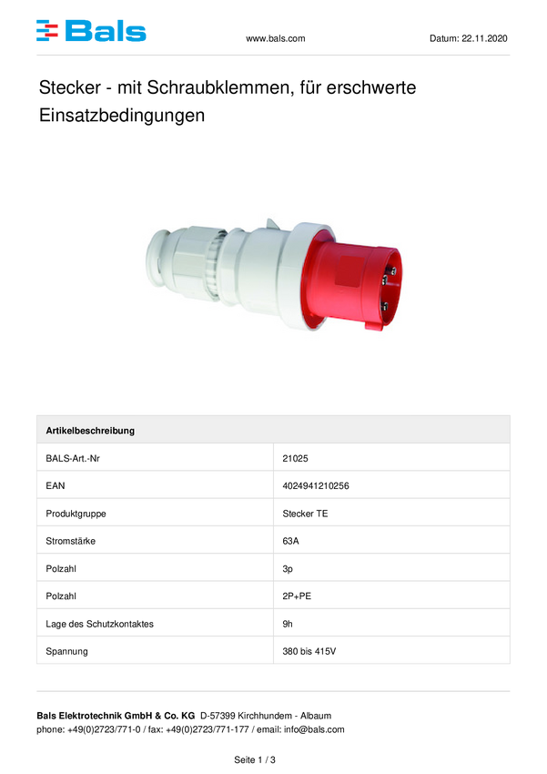 Złacze męskie CEE Bals Elektrotechnik 21025 63.0 A 400 V