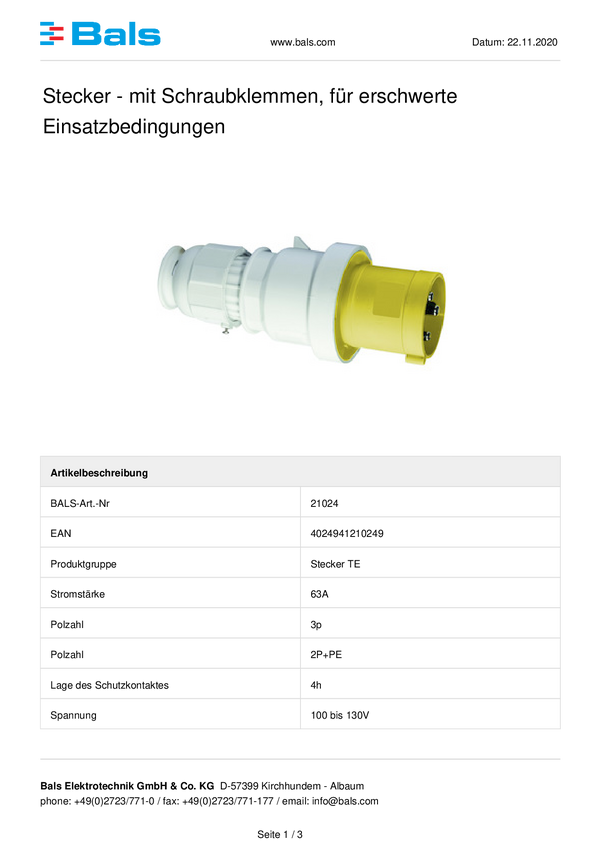 Złacze męskie CEE Bals Elektrotechnik 21024 63.0 A 110 V