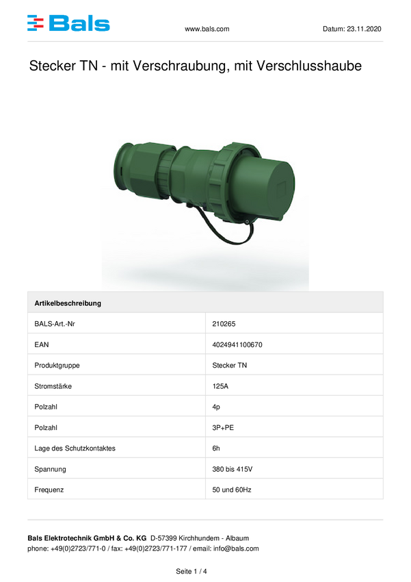 Złacze męskie CEE Bals Elektrotechnik 210265 125.0 A 400 V