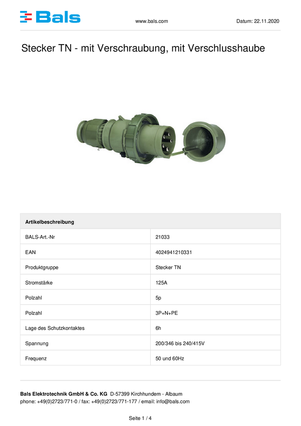 Złacze męskie CEE Bals Elektrotechnik 21033 125.0 A 400 V