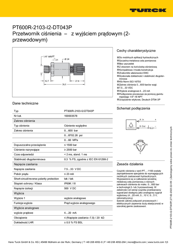 Turck Przetworniki ciśnienia 1 szt. PT600R-2103-I2-DT043P