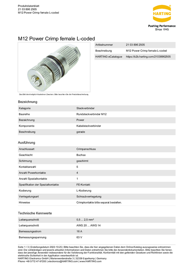 Harting 21038962505 Złącze męskie kablowe 21 03 896 2505, 1 szt.