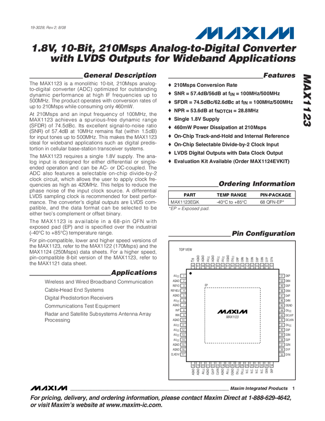 MAX1214N 1.8V, 12-Bit, 210Msps ADC for Broadband Applications