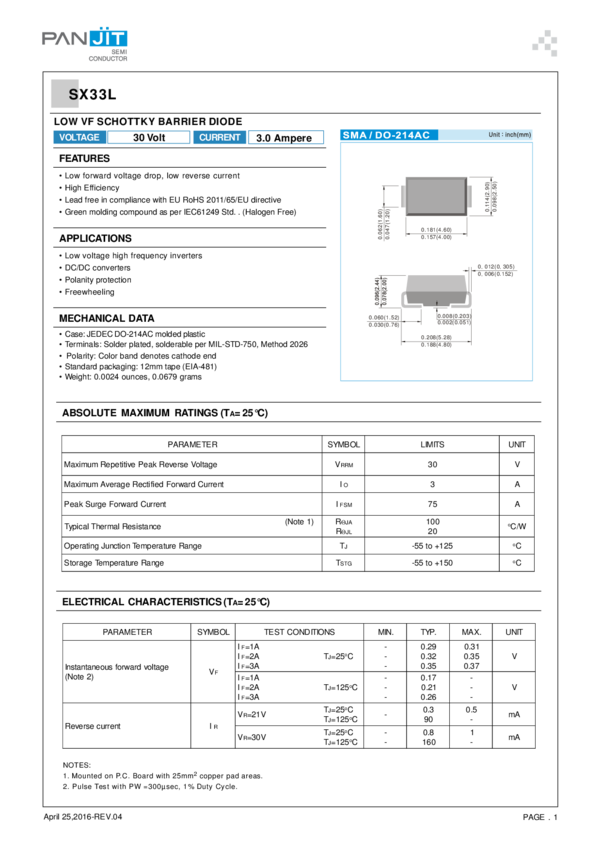 Diode Schottky 30V 3A 2-Pin DO-214AC Plastic T/R