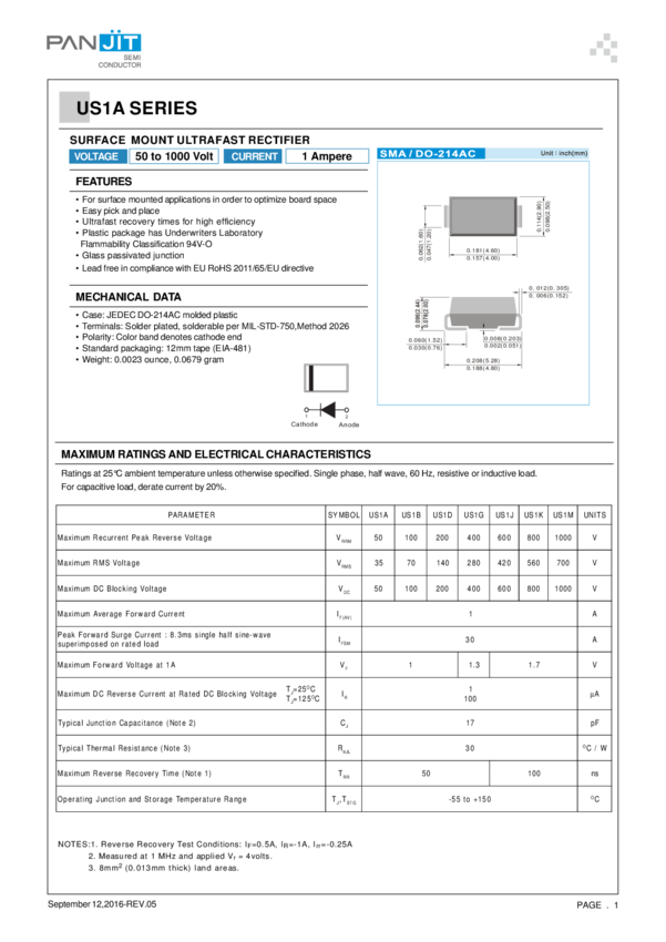 Diode Ultra Fast Rectifier 800V 1A 2-Pin DO-214AC Plastic T/R