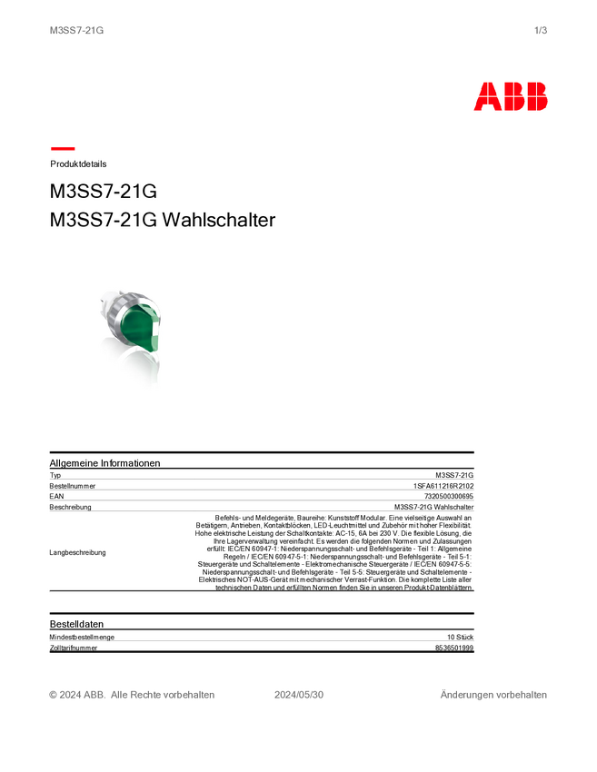 ABB 1SFA611212R2102 M3SS3-21G Podświetlany przełącznik wybierakowy przełącznik obrotowy 1 szt.