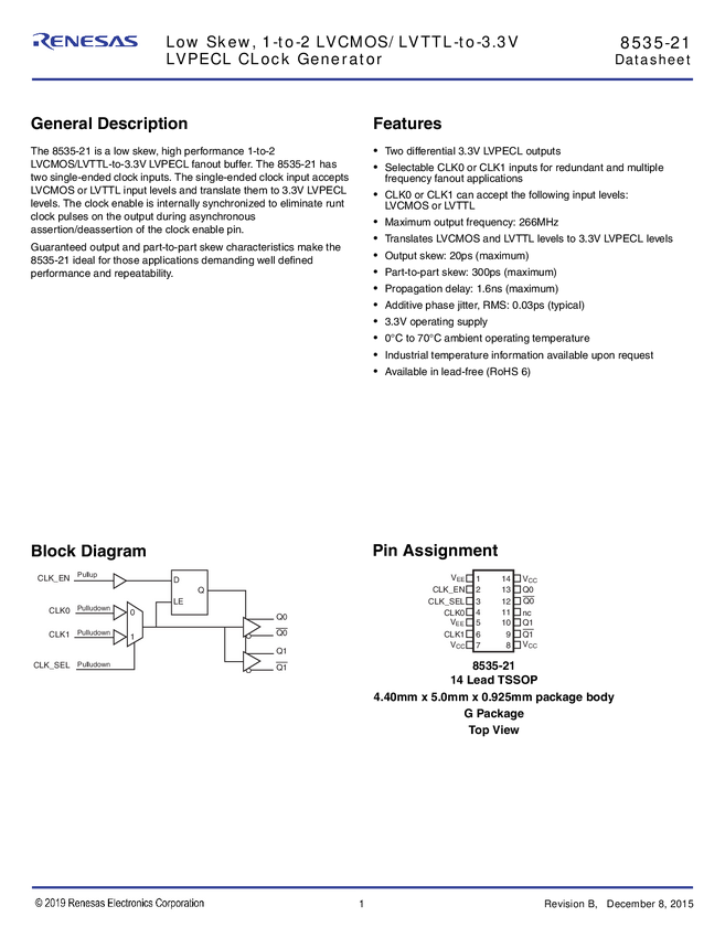 Low Skew,1-to-2 LVCMOS/LVTTL-to-3.3V LVPECL Clock Generator