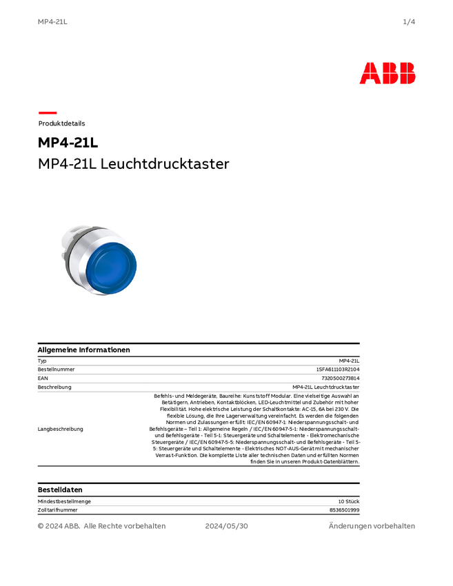 ABB 1SFA611103R2104 MP4-21L Przycisk podświetlany niebieski 1 szt.