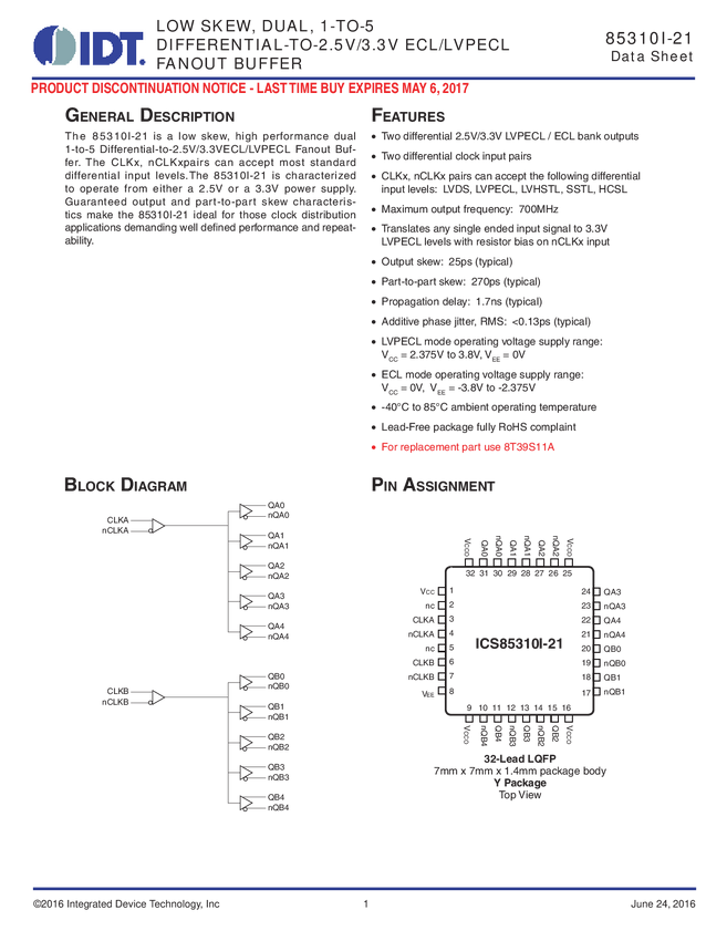 Low Skew,Dual,1-to-5 Differential-to-2.5V/3.3V ECL/LVPECL Fanout Buffer