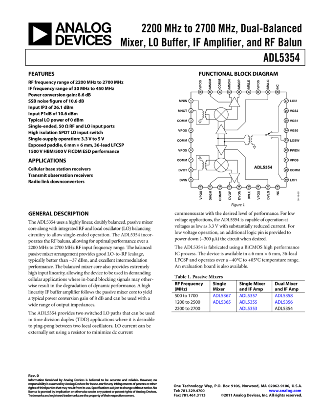 ADL5354: 2200 , Dual-Balanced Mixer, LO Buffer, IF Amplifier, and RF Balun