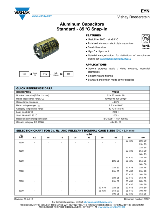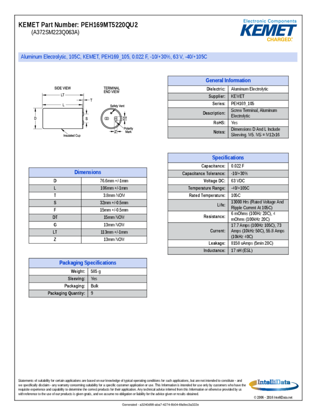 Cap Aluminum 22000uF 63V -10% to 30% (76.6 X 109.2mm) Screw Cylindrical Can 17700mA 12000 hr 105°C Bulk
