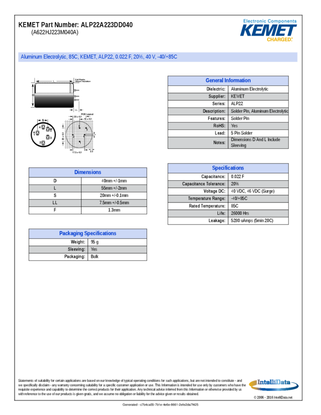 Cap Aluminum 22000uF 40V 20% (40 X 55mm) 26000 hr 85°C Bulk