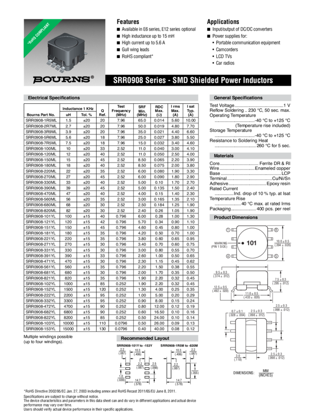 Ind Power Shielded Wirewound 180uH 10% 1KHz 12Q-Factor Ferrite 800mA T/R