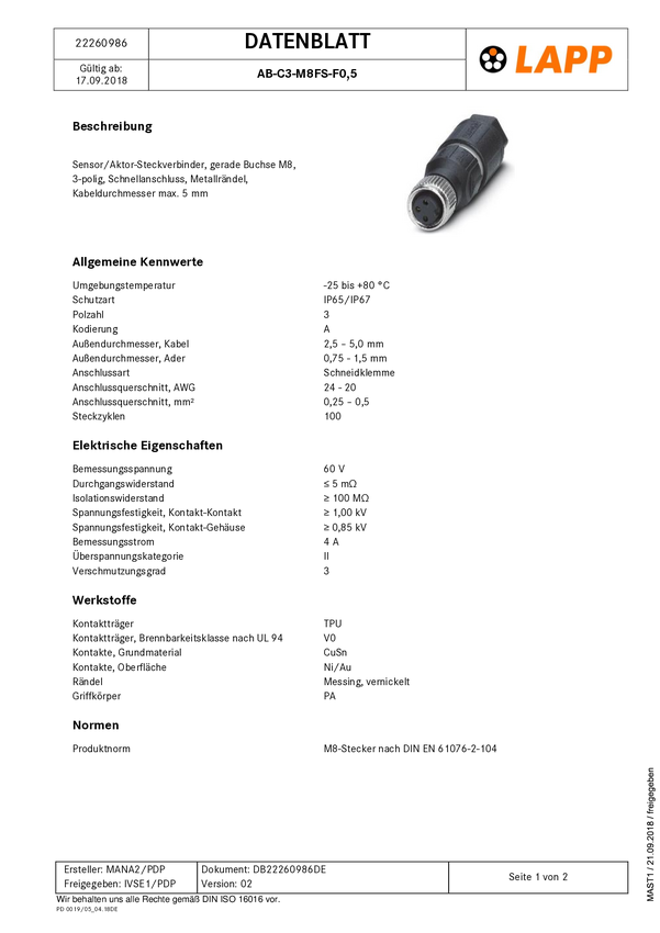 LAPP 22260847 Wtyczka złącza 1 szt.