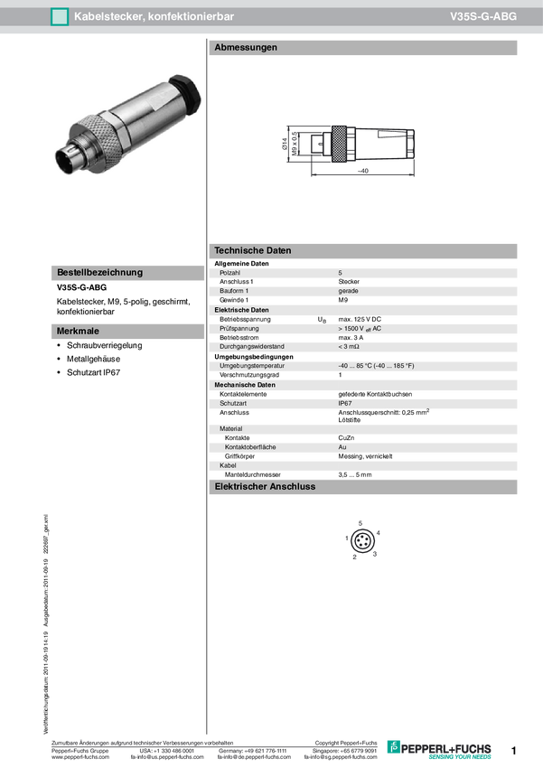 Pepperl+Fuchs 222697 Złącze niekonfekcjonowane czujnika/aktuatora M9 złącze męskie proste Ilość pinów: 5 1 szt.