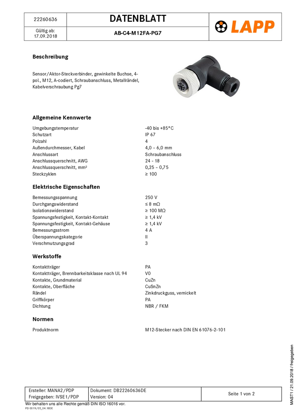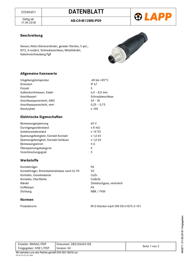 LAPP 22262047 Wtyczka złącza Lapp Zubehör, 1 szt.