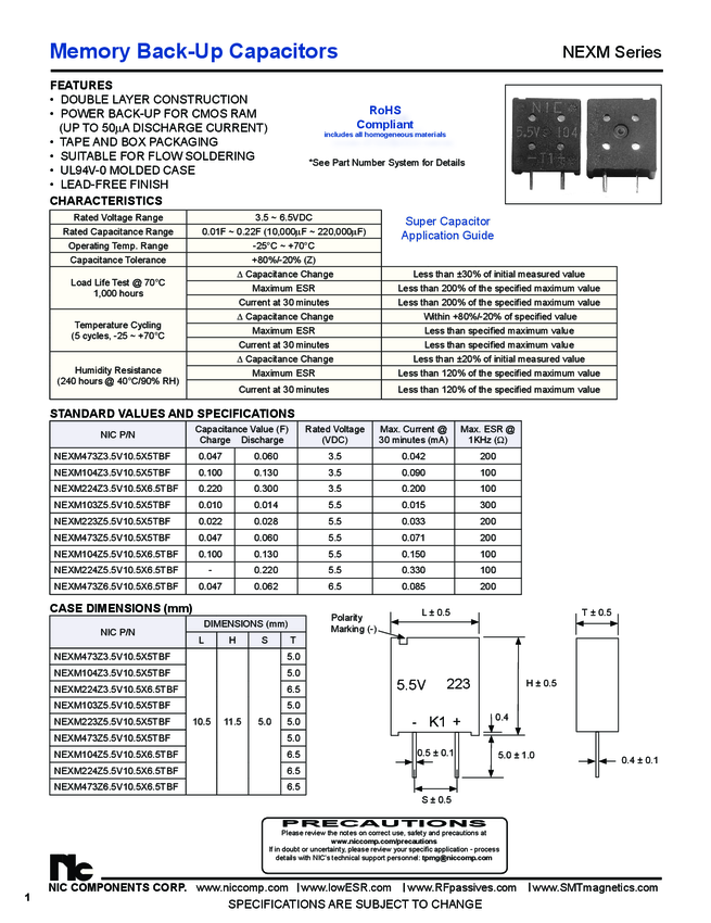 Cap 0.22F 5.5V -20 to 80% 1000 hr (12.5 X 10.5mm) Cylindrical 85°C T/R