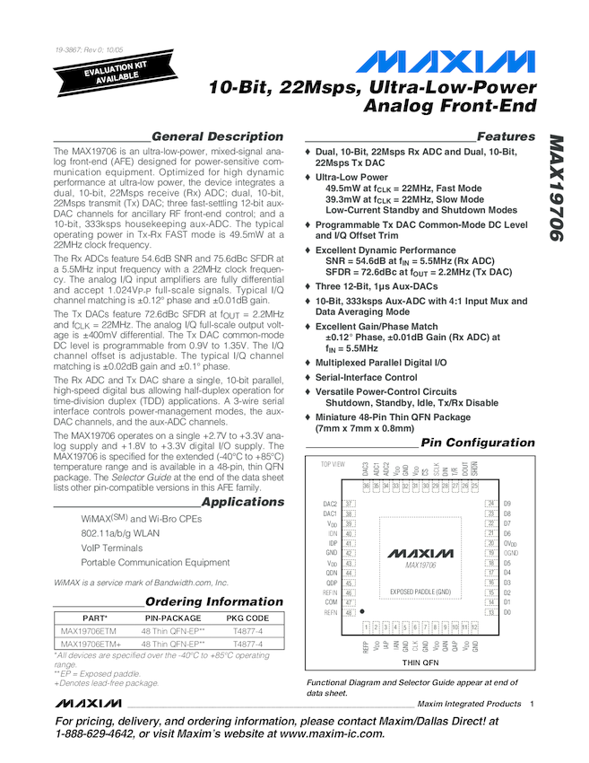 MAX19706 10-Bit, 22Msps, Ultra-Low-Power Analog Front-End