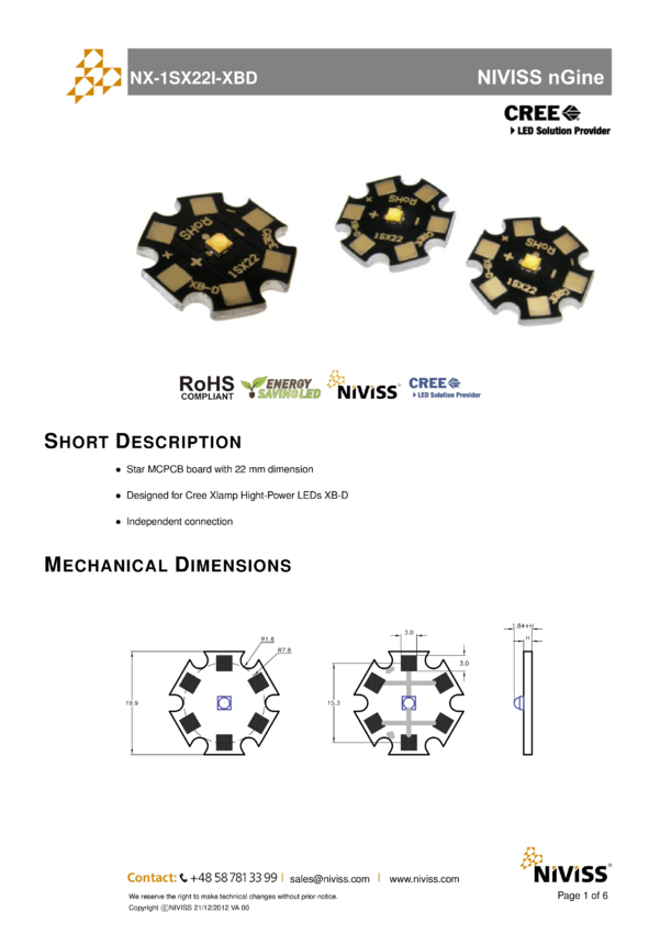 Moduł 4x LED Cree XB-D, , jasność Q3-93.9lm/350mA, barwa 7A4, gwiazdka 22mm, połączenie szeregowo-równoległe diod (2x2 LED), grubość 2mm, miedź 35um, biała soldermaska, powlekane złotem, formatka=24szt