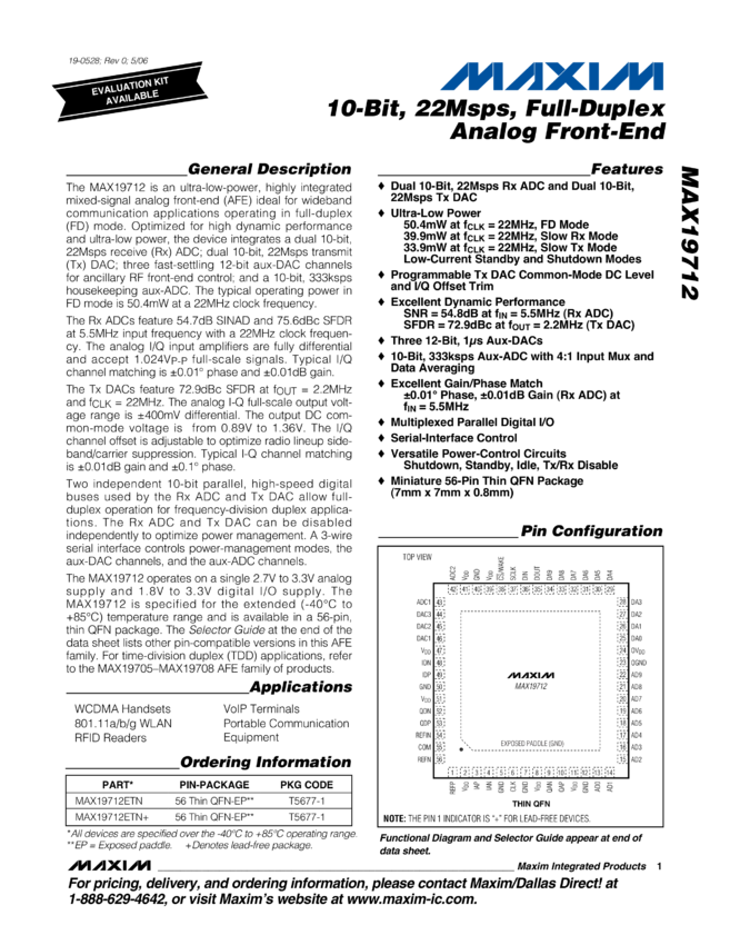 MAX19712 10-Bit, 22Msps, Full-Duplex, Analog Front-End