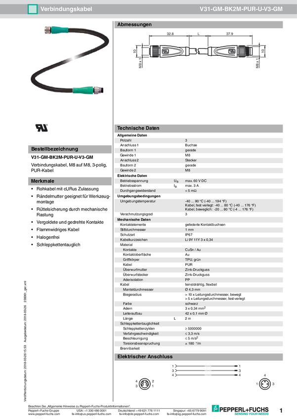 Pepperl+Fuchs 230060 Złącze czujnika/aktuatora M8 złącze męskie proste, złącze żeńskie proste 5.00 m Ilość pinów: 3 1 sz