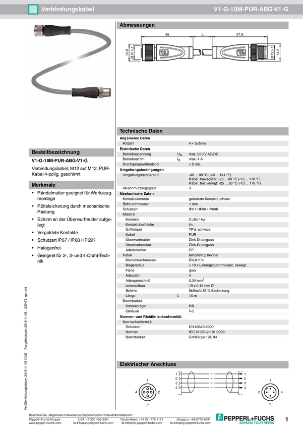 Pepperl+Fuchs 230176 Złącze czujnika/aktuatora M12 złącze męskie proste, złącze żeńskie proste 10.00 m Ilość pinów: 4 1