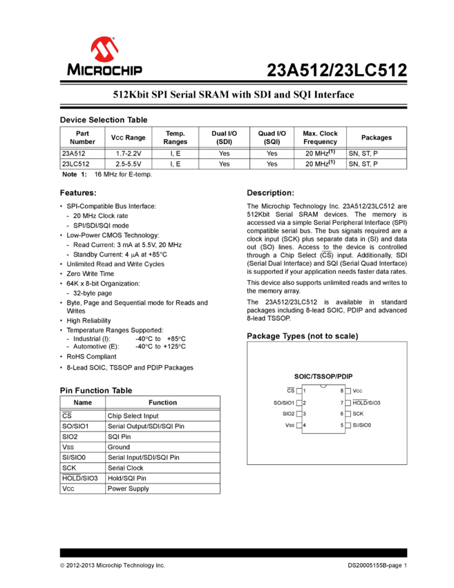 23A512/23LC512 512 Kbit SPI Serial SRAM with SDI and SQI Interface (09/28/2012)