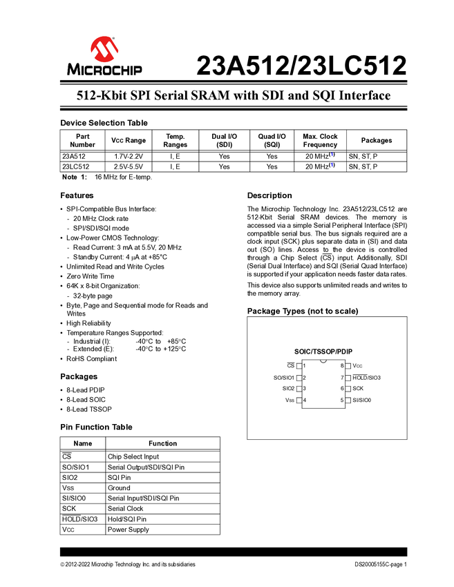 23A512/23LC512 512-Kbit SPI Serial SRAM with SDI and SQI Interface