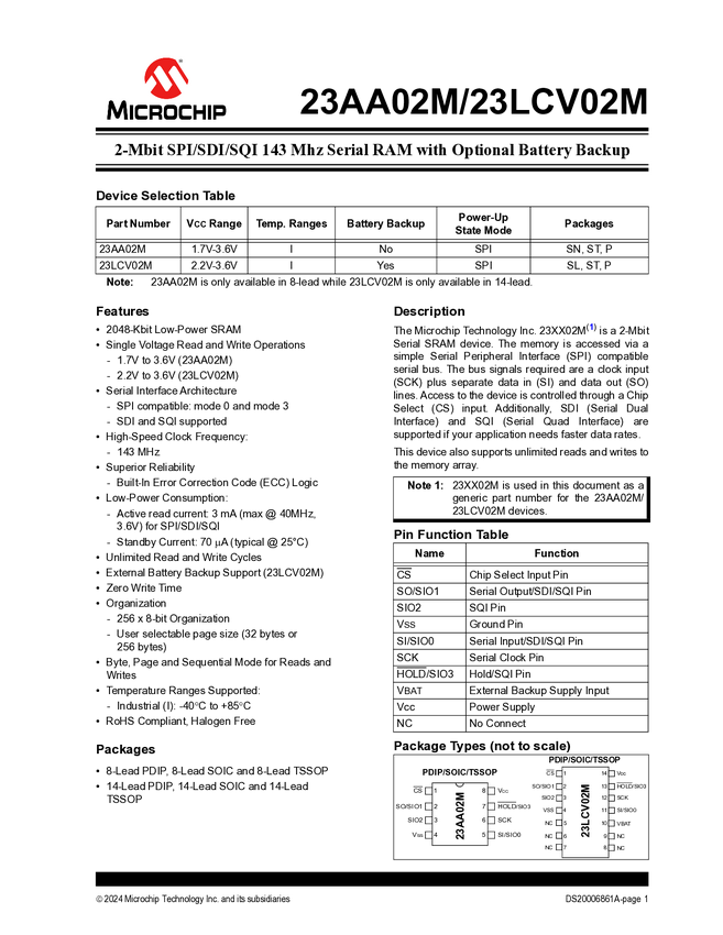 23AA02M/23LCV02M - 2-Mbit SPI/SDI/SQI 143 Mhz Serial RAM with Optional Battery Backup Data Sheet