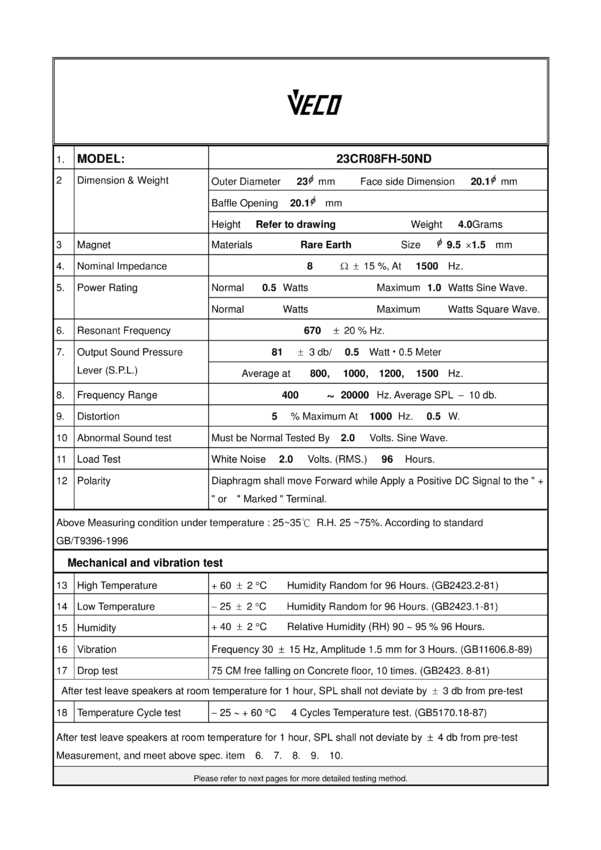 Głośnik LowProfil, 8Ω, 500mW, 400Hz-20kHz, fr=670Hz, D=23mm, h=5.3mm