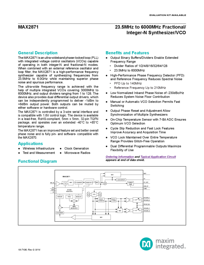 MAX2871 23MHz to 6000MHz Fractional/Integer-N Synthesizer/VCO