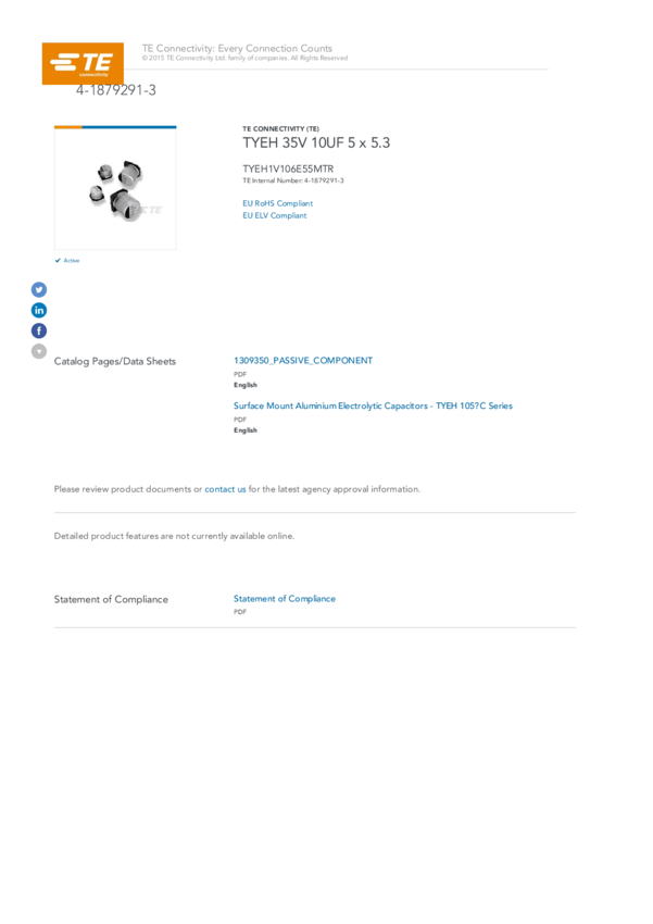Cap Aluminum 10uF 35V 20% (5 X 5.3mm) Cylindrical 23mA 1000 hr 105°C Tape and Reel