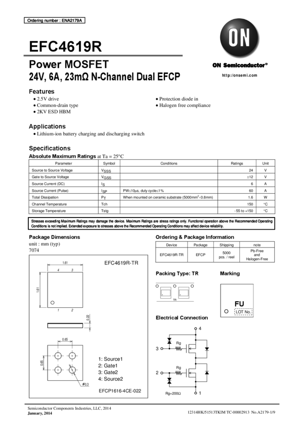 N-Channel Power MOSFET, 24V, 6A, 23mΩ Dual EFCP
