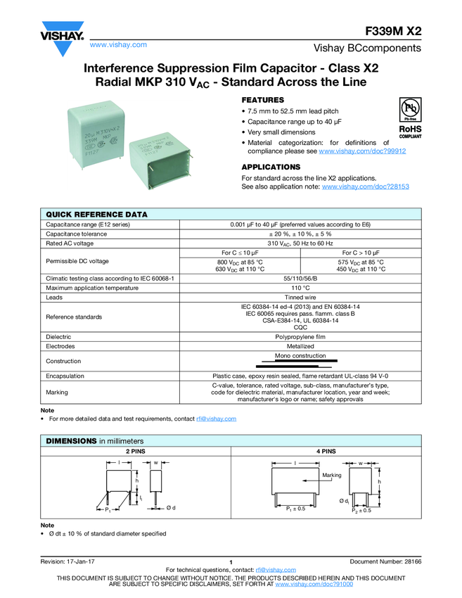 Cap Film 2.2uF 310VAC PP 20% (31 X 13 X 23mm) Radial 27.5mm 110°C Bulk