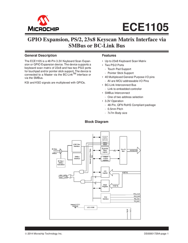 ECE1105 GPIO Expansion, PS/2, 23x8 Keyscan Matrix Interface via SMBus or BC-Link