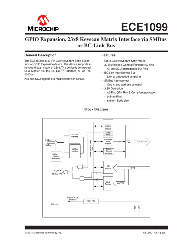 ECE1099 GPIO, 23x8 Keyscan Matrix Interface via SMBus or BC-Link Bus Product Bri